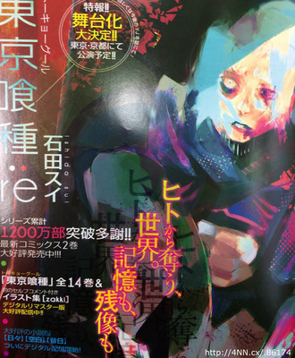 This year's 17th issue of Sheisha's Weekly Young Jump magazine is announcing on Thursday that Sui Ishida's Tokyo Ghoul manga is inspiring a stage play adaptation. The play will run in Tokyo and Kyoto. The magazine will publish more details about the production in the future.