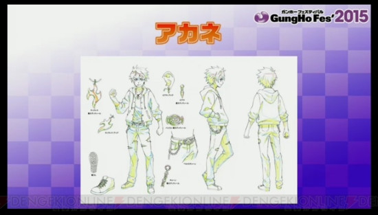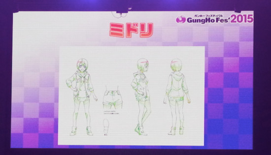 GungHo also presented character line art for the four characters who will be central to the anime's story (the colored images below the line art are the official character designs in the game for Akane, Aoto, and Midori):