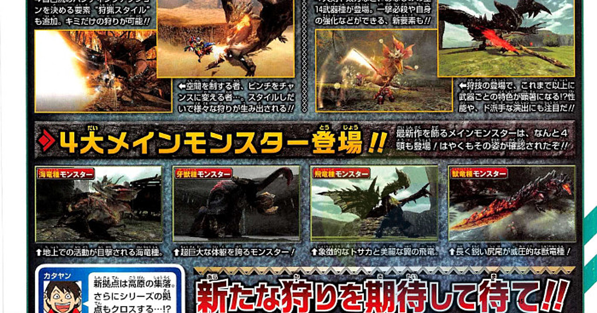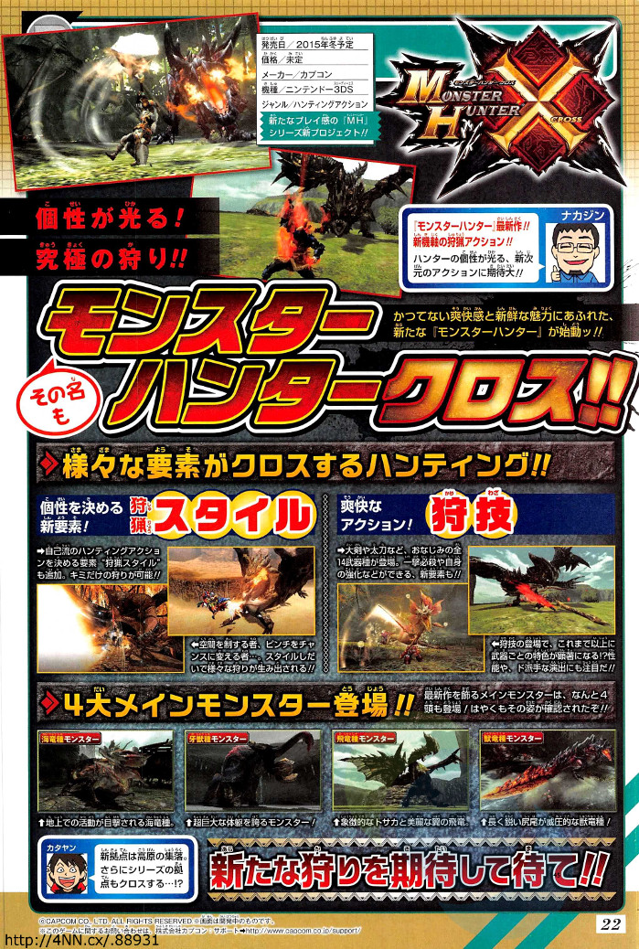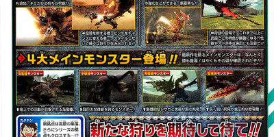 This year's 28th issue of Shueisha's Weekly Shonen Jump magazine is revealing more details on Monday for CAPCOM's upcoming Monster Hunter X (pronounced Cross) game for the Nintendo 3DS.