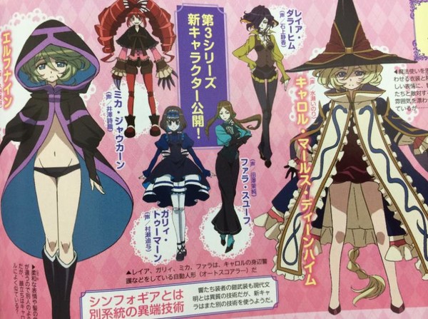 The July issues of Newtype, Animage, and Animedia magazines are announcing more of the new characters and their voice cast for the third Symphogear season, Senki Zesshō Symphogear GX.