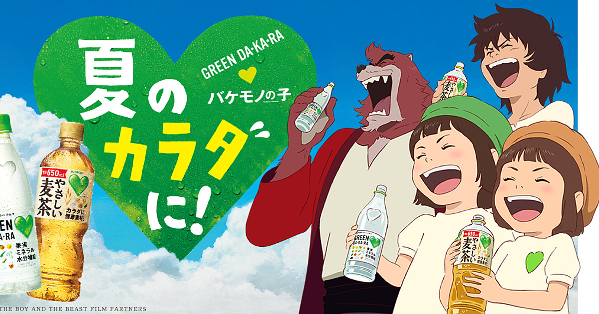 Director Mamoru Hosoda and his Studio Chizu animated a few crossover commercials between Hosoda's latest film The Boy and The Beast and SUNTORY's drink brand Green Da-Ka-Ra. In the first ad titled "Sashiire" (Insertion or Present), a song tells the story: the brand's Green Dakara-chan and Mugi-chan enter the world of The Boy and The Beast, and they give Green Da-Ka-Ra mineral water and barley tea to the movie's main character Kyūta and his beast teacher Kumatetsu: