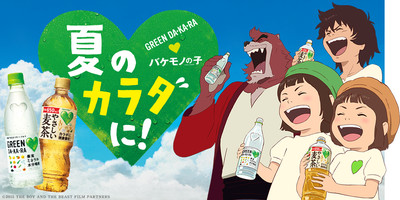 The child actress Suzuku-chan has been playing the mascot character Green Dakara-chan in a series of live-action commercials for SUNTORY's Green Da-Ka-Ra brand. Nagisa-chan, Suzuku-chan's little sister in real life, recently joined the campaign as Mugi-chan to promote Green Da-Ka-Ra Yasashii Mugicha ("Green Da-Ka-Ra Sweethearted Barley Tea").