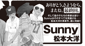 The August issue of Shogakukan's Monthly Spirits magazine announced on Saturday that Taiyo Matsumoto (Tekkonkinkreet, Ping Pong, GoGo Monster) will end his Sunny manga in the next issue on July 27. Matsumoto launched Sunny in Shogakukan's Monthly Ikki magazine in 2010.