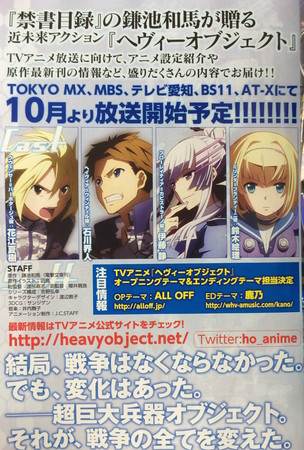 The September issue of Kadokawa's Dengeki Bunko magazine revealed the theme song artists on Monday for the television anime of Kazuma Kamachi's (A Certain Magical Index) Heavy Object light novel series.