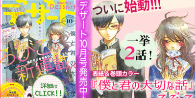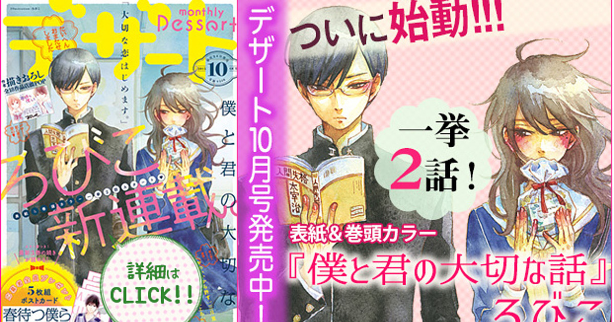 The October issue of Kodansha's Dessert magazine published the first two chapters of manga creator Robico's new Boku to Kimi no Taisetsu na Hanashi (An Important Talk Between You and Me) manga series on Monday.