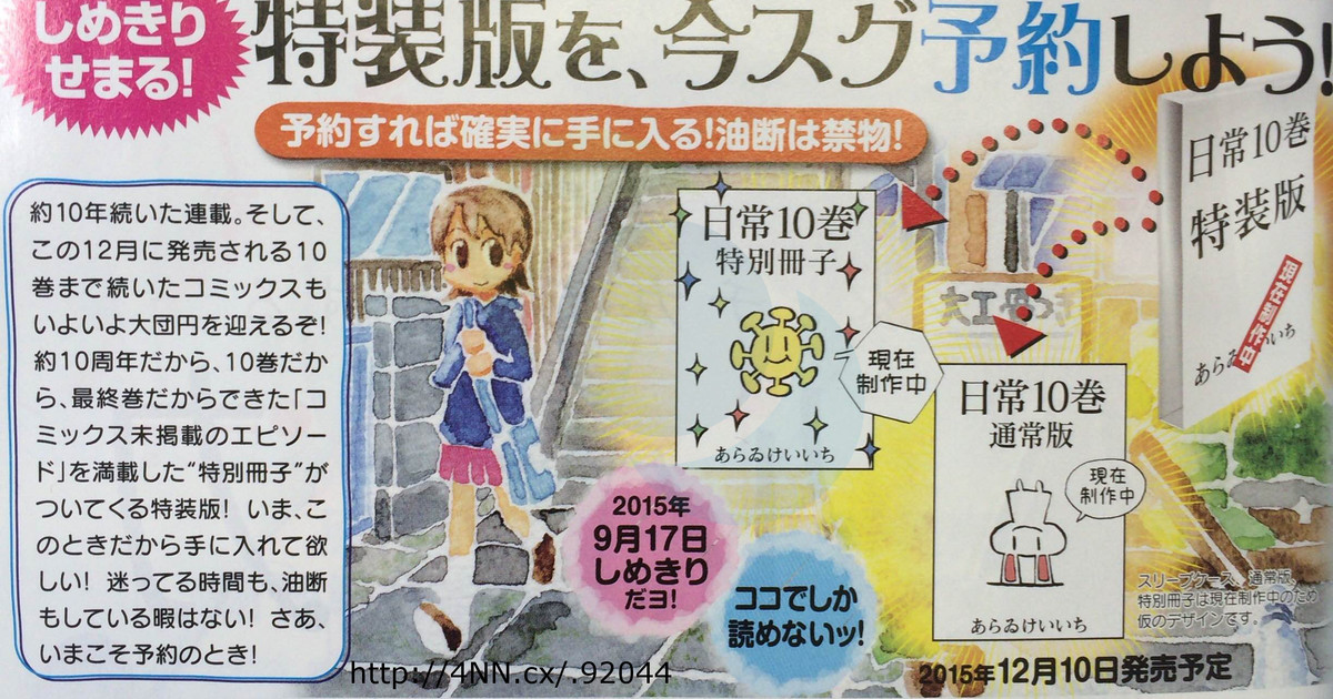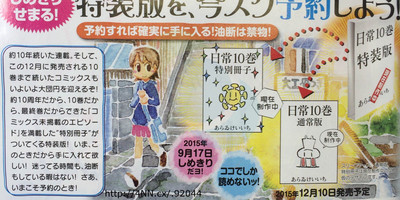 The October issue of Kadokawa's Monthly Shōnen Ace magazine is revealing on Wednesday that Keiichi Arawi's Nichijō manga will end this year with the manga's 10th volume, which will ship in Japan on December 10. Kadokawa will also publish a special edition of the volume on the same day, which will include a special booklet featuring unpublished "episodes" from the manga. The special edition will cost 980 yen (about US$8). The pre-order deadline for the special edition is September 17.