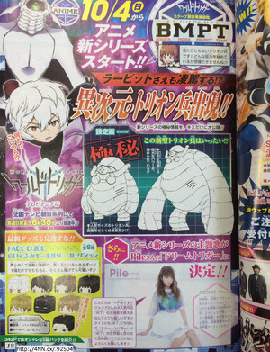 This year's 41st issue of Shueisha's Weekly Shonen Jump magazine is revealing on Monday that voice actress and singer Pile (Love Live!'s Maki Nishikino, Tenkai Knights, Duel Masters VS R theme songs) will contribute a song titled "Dream Trigger" as the theme song of the upcoming new World Trigger anime series. In addition, the magazine notes that the new anime series will premiere in Japan on October 4.