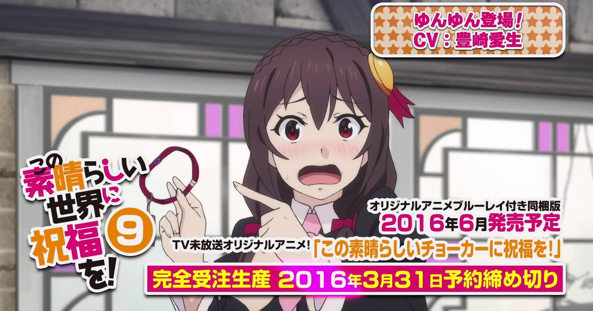 Light novel author Natsume Akatsuki is penning the original anime episode, which is titled "Kono Subarashii Choker ni Shukufuku o!" (God's Blessing on This Wonderful Choker!). The deadline to order the limited edition is March 31.