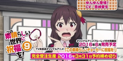 Kadokawa began streaming a 15-second ad on Thursday for the original video anime on Blu-ray Disc that will ship with the limited edition of the ninth Kono Subarashii Sekai ni Shukufuku o! (KonoSuba – God’s blessing on this wonderful world!!) light novel volume in June. The video reveals that Aki Toyosaki will play the character Yunyun in the episode. The character will not appear in the television anime series.