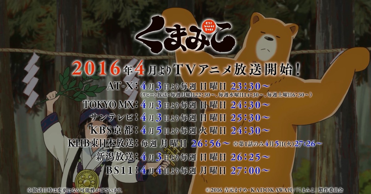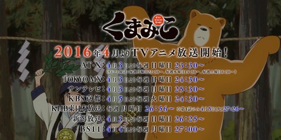 Kadokawa began streaming a 15-second commercial and a 30-second commercial for the television anime of Masume Yoshimoto's Kuma Miko: Girl Meets Bear manga on Tuesday. Maki Hanatani from idol group Fullfull☆Pocket is performing the opening theme song "Datte, Gyutte Shite" that is heard in the first commercial, while Machi Amayadori (as voiced by Natsumi Hioka) and Natsu Kumai (Hiroki Yasumoto) are performing the ending theme "KUMAMIKO DANCING" in the second one.