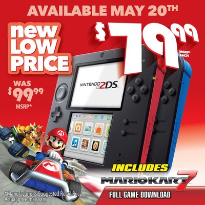 Nintendo of America announced on Wednesday that the Nintendo 2DS handheld gaming system price will drop from US$99.99 to US$79.99 on May 20. The system will still come bundled with the Mario Kart 7 digital version.