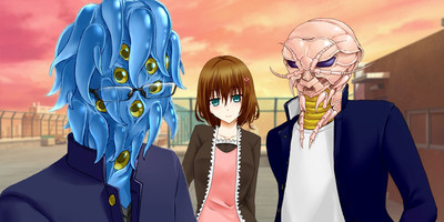 Both Creature Romances games feature a human protagonist who interacts with human-shaped but non-human characters. Creature Romances: Kokonoe Kokoro♥ (pictured in top image above) is a romance between the male player character and a non-human female character, while in Creature Romances: ~for the Ladies~ (pictured in bottom image above) the female protagonist has several male non-human romantic options.