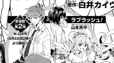 The second series is Ryōhei Yamamoto Love Rush! manga (pictured below), which will premiere in the 38th issue on August 22. Yamamoto previously serialized the E-ROBOT series in Weekly Shonen Jump from November 2014 to February 2015. Viz Media published the first three chapters of the series in English.