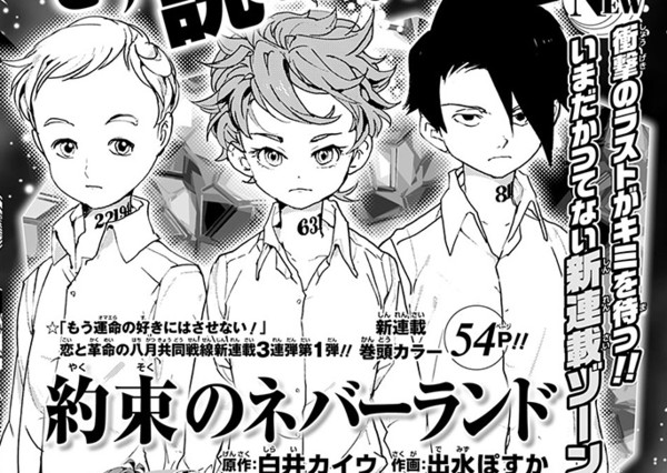 The 34th issue of Weekly Shonen Jump also revealed that it will launch three new series in August. Author Kaiu Shirai (Ashley Gate no Yukue) and illustrator Posuka Demizu will launch the Yakusoku no Neverland manga (pictured below) in the 35th issue on August 1. The first chapter will have an opening color page and will be 54 pages long. The manga will center on children who live in an orphanage, and the destiny that awaits them. Shirai and Demizu previously collaborated on the "Popy no Negai" one-shot in Shonen Jump+ in February.