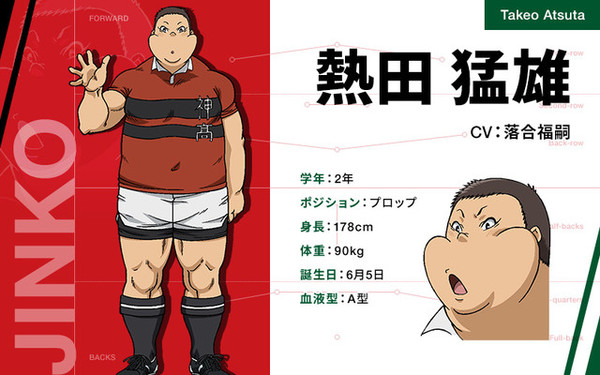 Fukushi Ochiai as Takeo Atsuta, a second-year who plays prop. His body may be big, but he is meek. He sometimes used honorific speech when he was a first-year, too. He greatly respects Hirota.