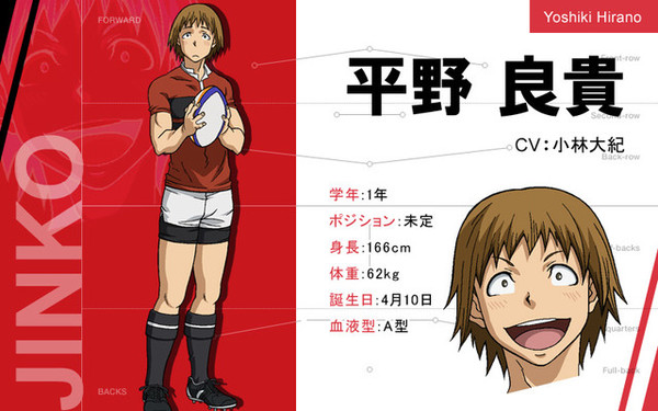 Daiki Kobayashi as Yoshiki Hirano, a first-year rugby member of Kanagawa High School. He has no position yet because he's inexperienced in rugby. He is full of curiosity, so he continues to try hard. He thought his classmate Kitamichi was having a lot of fun, so he decided to join the rugby team.