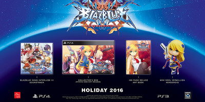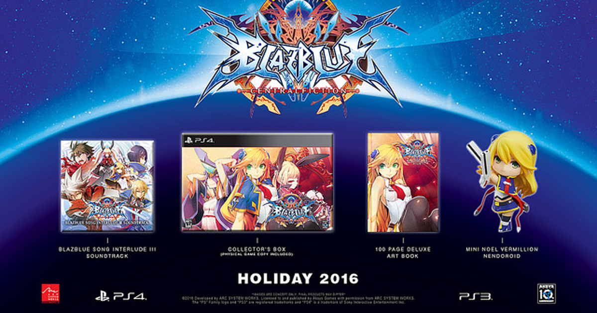 Sony's PlayStation blog additionally revealed the game's limited edition on August 24, and revealed that the limited edition and the standard edition are both set for a November release. The limited edition will include a collector's box, a hardcover art book, a mini Noel Vermillion Nendoroid figure, and a "BlazBlue Song Interlude III" soundtrack with 10 tracks. The limited edition is available for both PS4 and PS3.