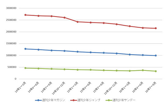 The graph below shows circulation numbers for Weekly Shōnen Magazine in blue, Weekly Shonen Jump in red, and Weekly Shonen Sunday in green. The graph shows the periods from January-March 2014 to July-September 2016.