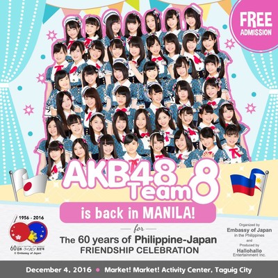 The official Facebook page of Manila-based AKB48 spinoff group MNL48 announced on Friday that AKB48's "Team 8" sub-unit will perform in Metro Manila, Philippines as part of the "60 Years of Philippine-Japan Friendship Celebration" event. The performance will be held at the Market! Market! Activity Center in Taguig on December 4, and entrance will be free.