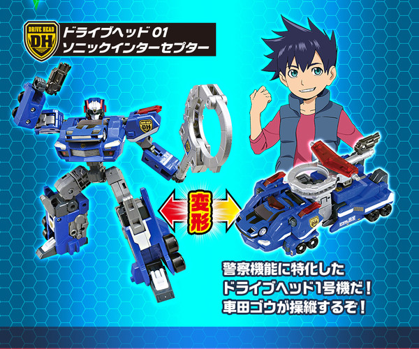 "'Drive Heads' are special vehicles that change from car forms to humanoid walker vehicles. The grade schooler Gō Kurumada and other children found to be suitable become drivers and join forces with the mobile emergency police and other adults. Even now, they race to the scene to protect the peace and security of all humanity. Go Rescue!"