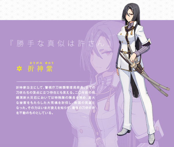 Yukari Origami, the head of the Origami Family and director of the police swords administration bureau. It can be said she stands above all sword-users. She became a hero 20 years ago when, while serving as leader of a task force during a disaster at the Sagami coast, she defeated a large aratama that had dealt massive damage. Her power has not weakened, and she remains the strongest.