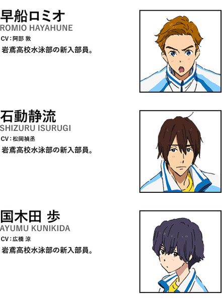 - Atsushi Abe as Romio Hayahune, a rookie member of the Iwatobi High School Swimming Club