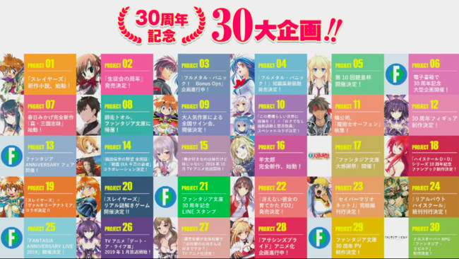 Dragon Magazine editor-in-chief Kōtarō Kobayashi also revealed during the presentation the full lineup of the 30 projects featured for the 30th anniversary of Fantasia Bunko imprint this year.