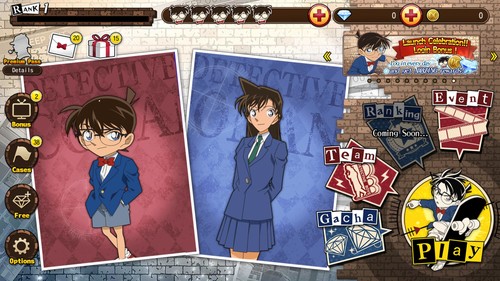 In running gameplay, players can tap the screen for characters to jump, avoid obstacles, and collect points. Each character has unique skills. Players can collect illustrations, including original illustrations, and set them in the Home menu. The game will include story scenarios in which Conan and his friends solve cases.