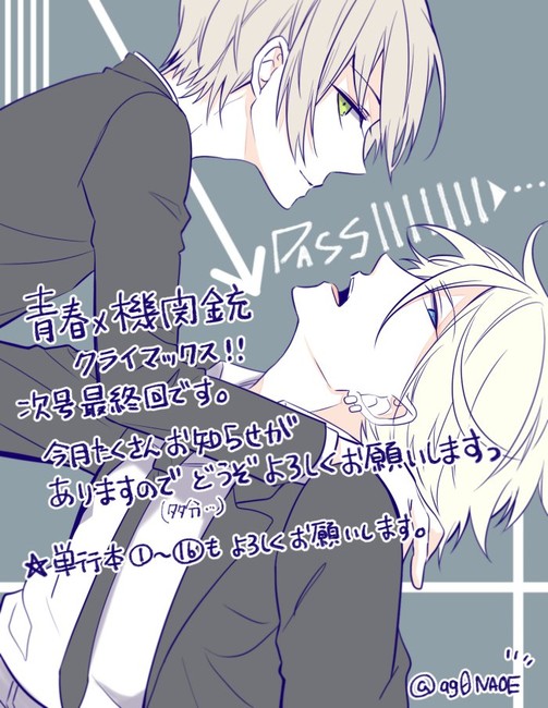 Manga creator NAOE revealed on her official Twitter account on Wednesday that her Aoharu x Machine Gun manga will end in Square Enix's G Fantasy magazine on August 18. The announcement also teased that NAOE may have more announcements this month.