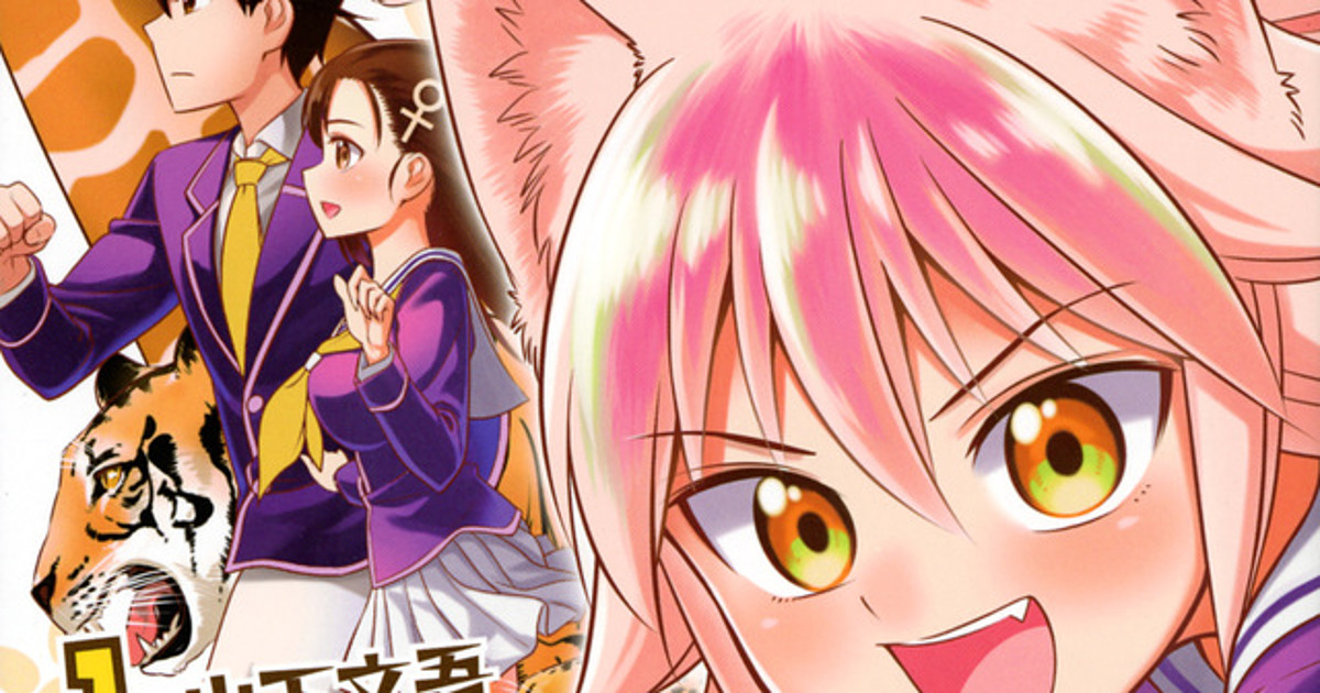 The "survival of the fittest animal romantic comedy" manga (pictured below) takes place at a school for animals, where the students' curricula centers on the idea of "survival of the fittest." The lone human in the class (who hates animals) and the lone wolf girl in the class meet, and their nonsense academy life begins.