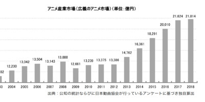 The Association of Japanese Animations (AJA) will publish its "Anime Industry Report 2019," which examines industry trends from 2018, on December 9. According to a preview of the report published on Friday, the anime market was valued at 2.1814 trillion yen (about US$19.9 billion) in 2018, a 0.9% increase from the previous year.