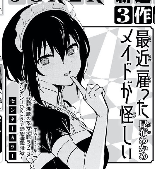 The website for Square Enix's Gangan Joker magazine revealed on Saturday that Wakame Konbu will launch a new manga titled Saikin Yatotta Maid ga Ayashii (The Maid We Hired Recently is Suspicious) in the magazine's February issue on January 22. The manga's first chapter will have a center color page.