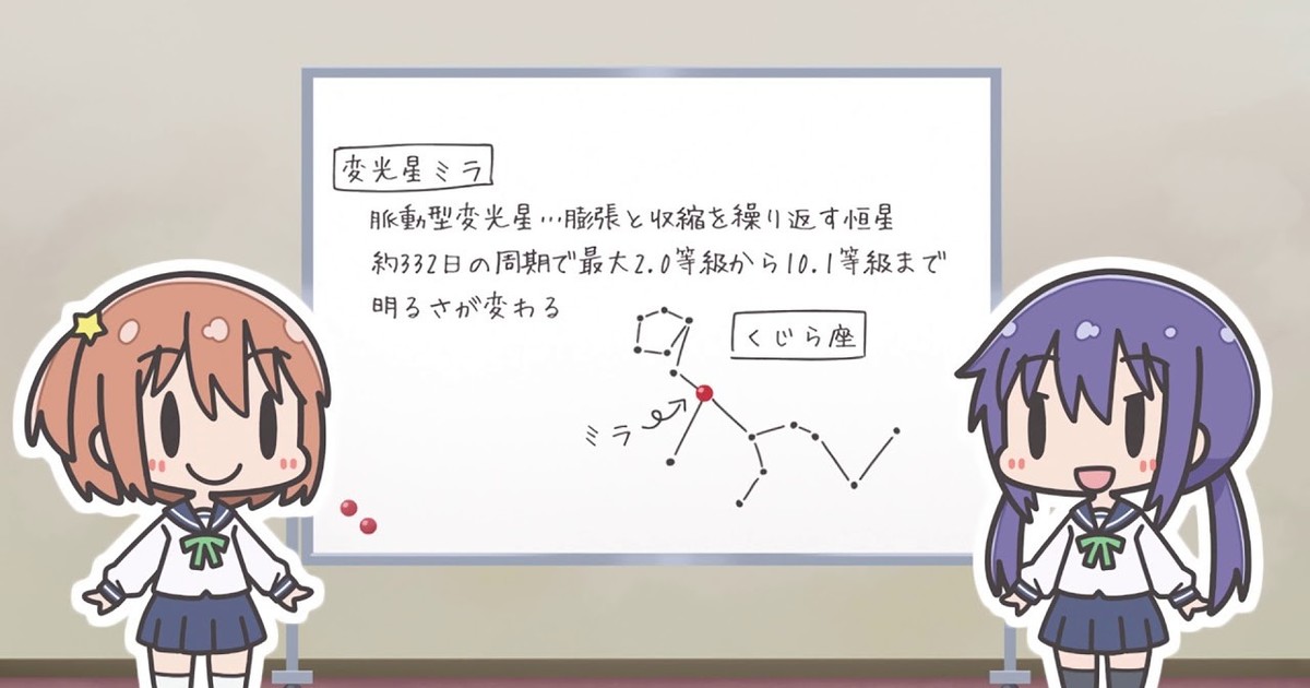 Kadokawa began streaming the first "KiraKira Zōkangō!" (KiraKira Special Edition!) anime short for the Asteroid in Love television anime on Saturday. In the series of shorts, the television anime's astrogeo club members discuss topics in astronomy and geology. The first episode focuses on Mira, a red giant star in the constellation Cetus that also appears in the television anime's first episode.