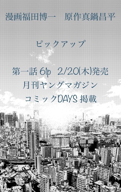 The February issue of Kodansha's Monthly Young Magazine revealed on January 18 that Shohei Manabe will launch a new manga titled Pickup with artist Hirokazu Fukuda in the magazine's next issue and on the Comic Days website on February 20. Manabe is credited for the original work, while Fukuda is credited for the art. The 61-page first chapter will have a color opening page.