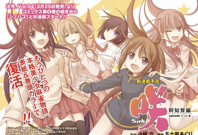 This year's third issue of Square Enix's Monthly Big Gangan announced on Tuesday that Ritz Kobayashi and Aguri Igarashi's Saki Achiga-hen episode of side-A spinoff manga will resume in the next issue on March 25. The manga will continue the story from the sixth compiled book volume that shipped in August 2013. The first new chapter will have color opening pages, the series will appear on the upcoming magazine issue's cover, and a clear file for the manga will bundle with the issue.