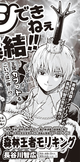 The first new series is Tomohiro Hasegawa's Shinrin Ōsha Mori King (Forest Ruler Mori King) manga, which will launch in the 20th issue on April 13. Weekly Shonen Jump teases that the gag manga will feature an older sister and younger brother who get along very well, and a surprising encounter. The manga will feature on the cover of the magazine's 20th issue, and the first chapter will have 46 pages. Hasegawa had published a similarly named "Shinrin Shugōsha Mori King" (Forest Protector Mori King) one-shot manga in Weekly Shonen Jump last July.