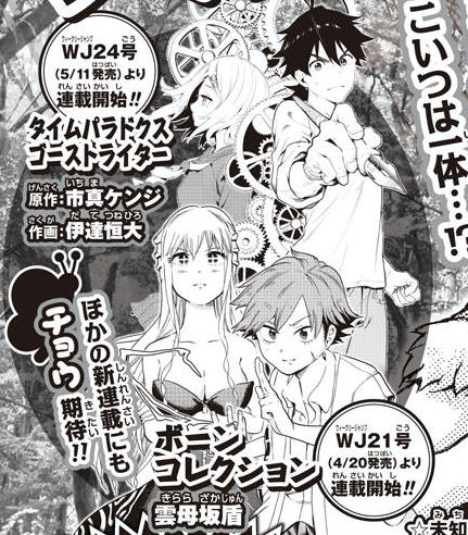 The second new series is Jun Kirarazaka's Bone Collection (pictured bottom in below image), which will launch in the 21st issue on April 20. The third new series is writer Kenji Ichima and artist Tsunehiro Date's Time Paradox Ghostwriter (pictured top in below image), which will start in the 24th issue on May 11.