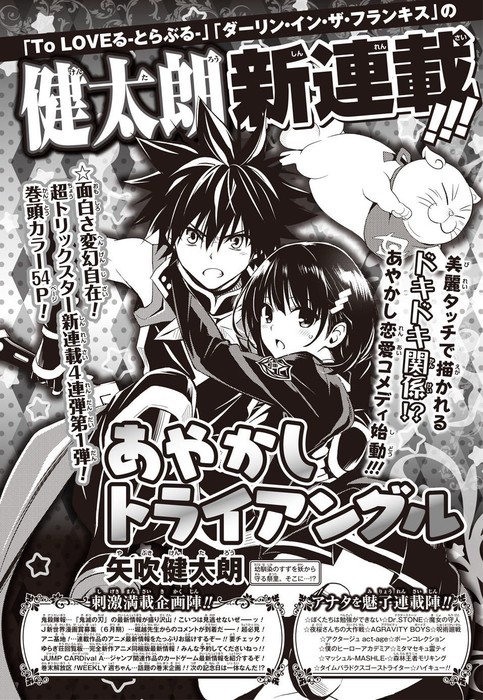 Kentarō Yabuki will launch the Ayakashi Triangle manga (seen above) in the magazine's 28th issue on June 15. The "ayakashi romantic comedy" manga centers on Matsuri, who protects his childhood friend Suzu from ayakashi (spirits or monsters). The first chapter will have 54 pages including an opening color page.
