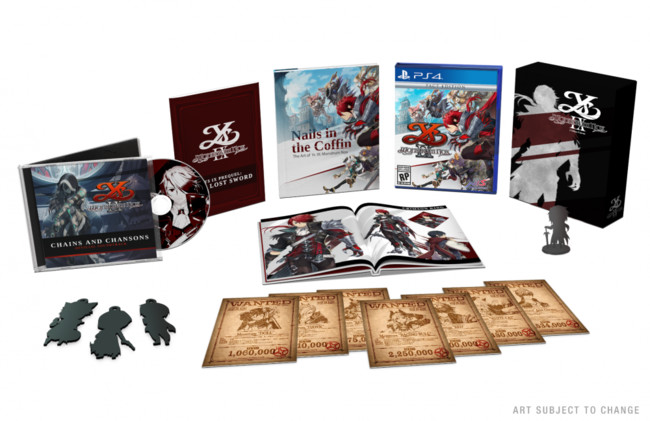 The limited "Pact Edition" of the game includes a mini art booklet, two soundtrack CDs, reverse cover sheet, a hardcover art book, "The Lost Sword" Ys IX prequel short novel, The Crimson King figure, art card collection, key chain set, and a box.