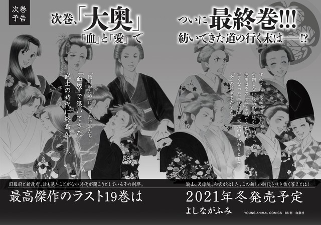 The 18th compiled book volume of Fumi Yoshinaga's Ōoku: The Inner Chambers manga revealed on Friday that the series will end in the 19th volume in winter 2021. The manga entered its final arc in the July issue of Hakusensha's Melody magazine on Saturday.