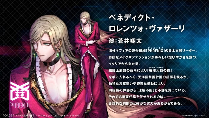 Shōta Aoi as Benedict Lorenzo Vasari, the Italian leader of the Japanese branch of the global organized mafia group Phoenix. His words are as honeyed as his quality makeup and designer clothes. Under orders to take control of Tengai Ward and retrieve the Yamatanoorochi no Kubi, he directs his local lieutenants, though many judge his manner to be vexing and often contradictory. Nevertheless, he always manages to appoint capable commanders, proving him an excellent judge of character.