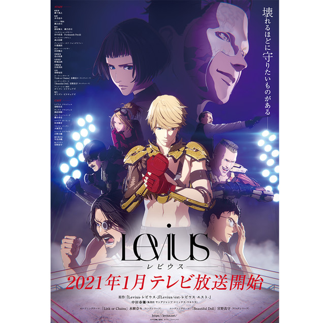The official website for the 3D CG anime series of Haruhisa Nakata's science-fiction boxing manga Levius revealed on Wednesday that the anime's television airing in Japan will feature new theme songs. Nana Mizuki is performing the opening theme song "Link or Chains," and Mamoru Miyano is performing the ending theme song "Beautiful Doll." The anime's television airing will premiere in January 2021.