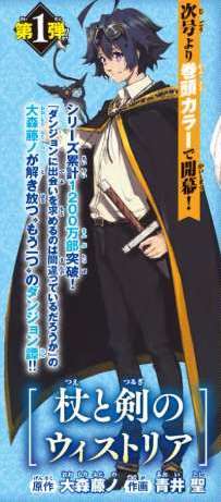 The first new project will be the Tsue to Tsurugi no Wistoria (Wistoria of Wand and Sword) manga. Fujino Ōmori (Is It Wrong to Try to Pick Up Girls in a Dungeon?) is credited with the original work, and Toshi Aoi is drawing the manga. The manga will launch in the magazine's next issue with an opening color page. The manga will tell "one more dungeon story."