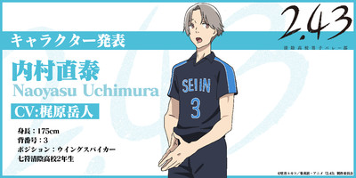 The official Twitter account for the television anime adaptation of Yukako Kabei's 2.43: Seiin Kōkō Danshi Volley-bu (Seiin High School Boys Volleyball Club) light novel series announced on Thursday that the anime has cast Gakuto Kajiwara (Black Clover's Asta) as Naoyasu Uchimura, a second-year student at Seiin High School and wing spiker on the boys' volleyball club.