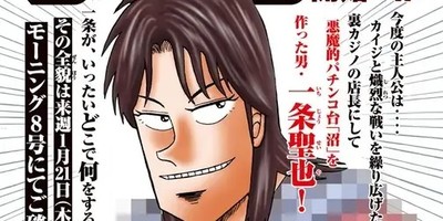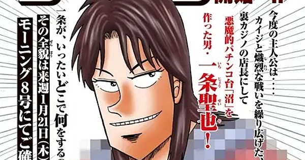 This year's seventh issue of Kodansha's Morning magazine revealed on Thursday that a spinoff of Nobuyuki Fukumoto's Kaiji manga will debut in the magazine's next issue on January 21. The manga will center on Seiya Ichijō. The magazine teased an incomplete version of the title in which "O" represents obscured text: "OOOO Roku Ichijō." Tensei Hagiwara is writing the story, and Tomoki Miyoshi and Yoshiaki Seto are drawing the manga.