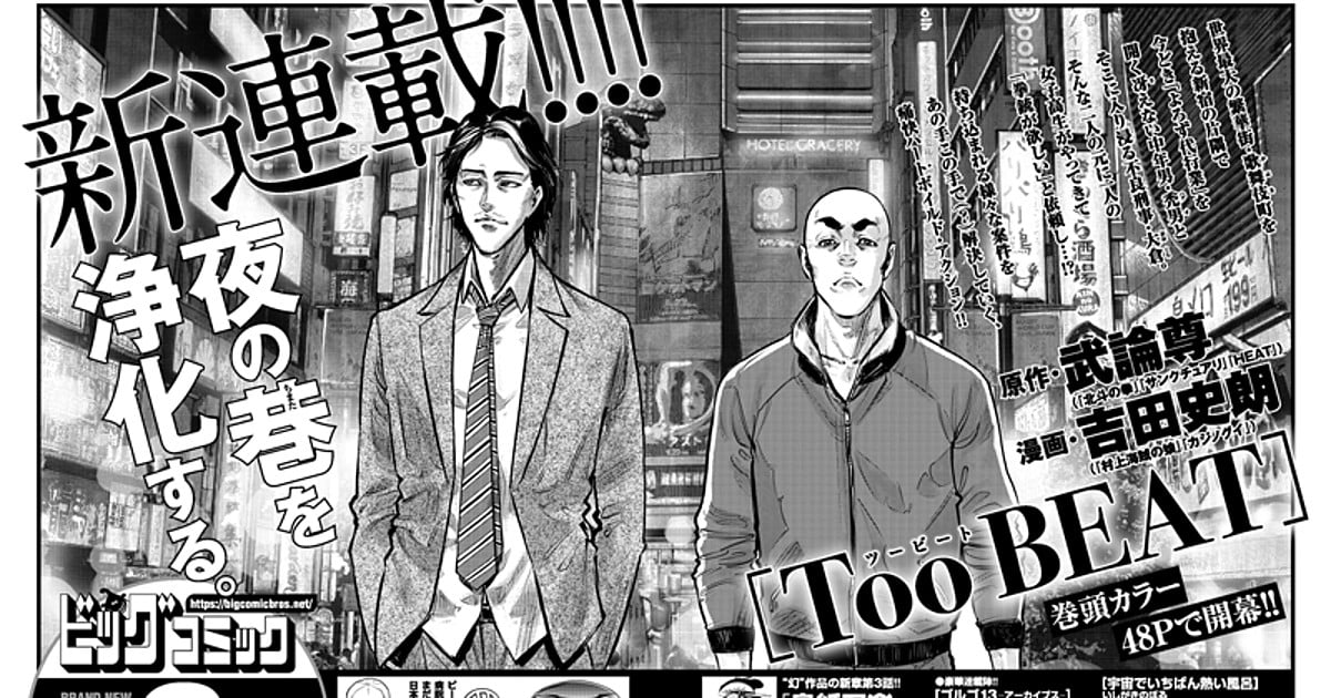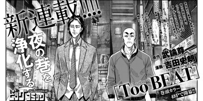 The March issue of Shogakukan's Big Comic Zōkan magazine revealed on February 17 that manga creators Buronson and Nozaki Hanaichi will launch a new manga titled Too Beat in the magazine's next issue on May 17. The manga will have a color opening page, and the first chapter will have 48 pages. Buronson is credited for the original work, and Hanaichi is credited for the art.