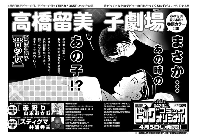 This year's seventh issue of Shogakukan's Big Comic Original magazine revealed on Friday that Rumiko Takahashi will draw a new one-shot manga titled "Mukashi no Onna" (The Woman From the Past) as part of her Rumic Theater (Takahashi Rumiko Gekijō) series in the magazine's next issue on April 5. The one-shot will have a color opening page.