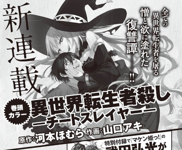 The June issue of Kadokawa's Monthly Dragon Age magazine revealed on Saturday that Homura Kawamoto will launch a new manga titled Isekai Tenseisha Koroshi - Cheat Slayer (The Killer of the Reincarnated - Cheat Slayer) in the magazine's next issue on June 9. Kawamoto is writing the story, while Aki Yamaguchi is drawing the art.