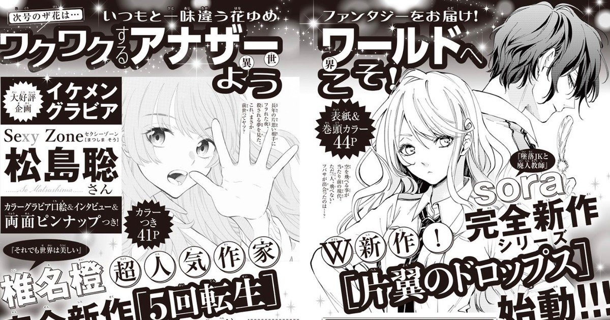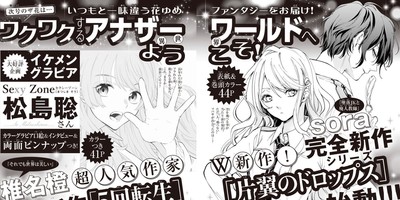 sora is the pen name of manga creator Sora Mizuki. Their new manga Henyoku no Drops (One-Winged Drops, right in image above) will appear on the magazine issue's front cover, and the first chapter will have 44 pages including a color opening page. The manga centers on Tsubasa, the only person who cannot fly in a modern world where flying is commonplace.