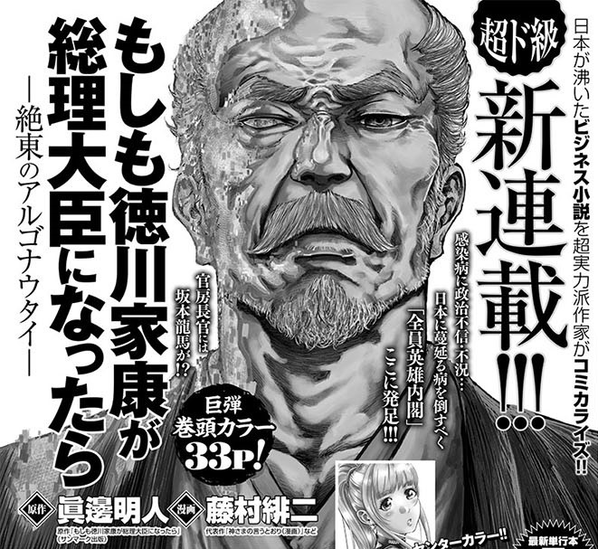 The April issue of Akita Shoten's Bessatsu Young Champion magazine revealed on Tuesday that Akeji Fujimura is launching a manga adaptation of Akihito Manabe's Moshimo Tokugawa Ieyasu ga Sōri Daijin ni Nattara (What if Tokugawa Ieyasu Became Prime Minister?) business novel in the magazine's next issue on April 5. The manga's first chapter will have 33 pages and will have a color opening page.